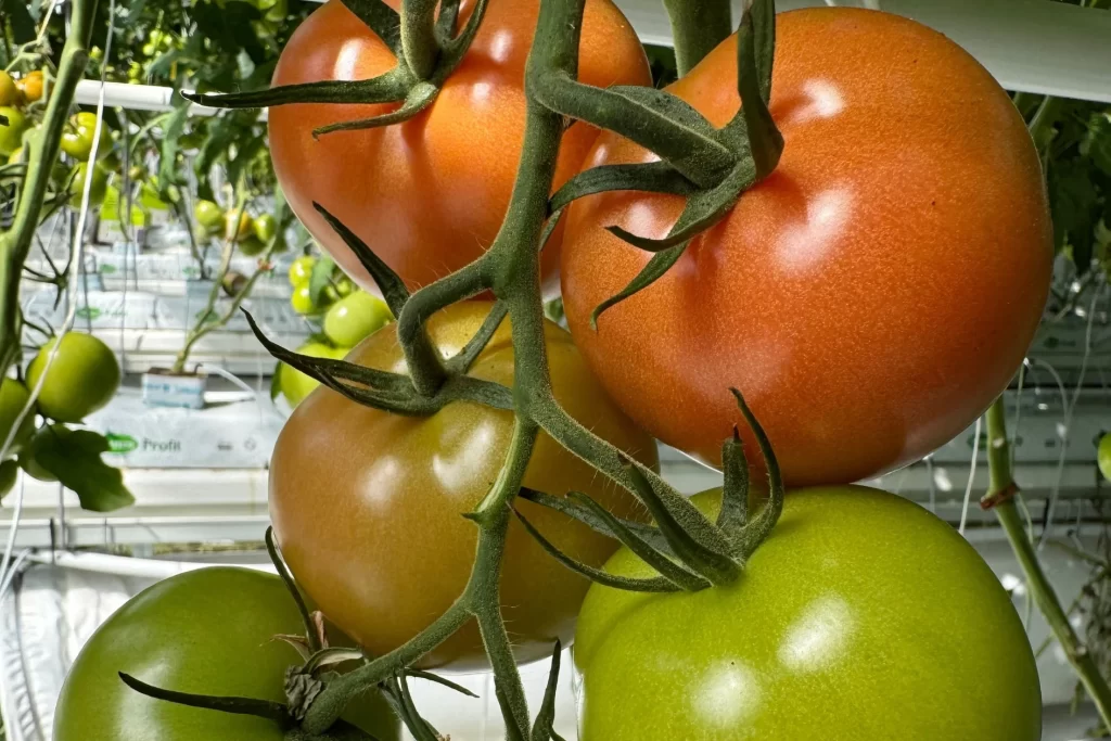 Tomater på stilk, der udgør 80% af produktionen i drivhuset, høstes på det optimale tidspunkt for at sikre den bedste smag og kvalitet. Blommetomater, der udgør de resterende 20%, er specielt velegnede til madlavning, herunder tomatsauce og gryderetter.